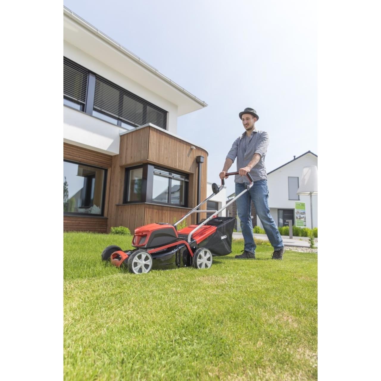 Sicheres Starten dank Steckschlüssel. Der 40-Volt-Lithium-Ionen-Akku sorgt für ein effizientes Arbeiten auf Rasenflächen mit bis zu 400 m². Dank der Li-Ion-Zellen ist dieser Akku außergewöhnlich langlebig und hat keine Selbstentladung. Durch die integrierte LED-Anzeige können Sie ganz einfach ablesen, wann aufgeladen werden muss. Aufgeladen ist der Akku in ca. 1,5 Stunden. Bequeme zentrale Schnitthöhenverstellung, bei der die Schnitthöhe zwischen 30 und 75 mm einstellbar ist. Die große Gewebefangbox mit Füllstandsanzeige fasst 60 und wird dank der aerodynamischen Gehäuseform effektiv gefüllt. Der ergonomische Führungsholm und die kugelgelagerten Räder ermöglichen Ihnen ein ermüdungsarmes Rasenmähen.