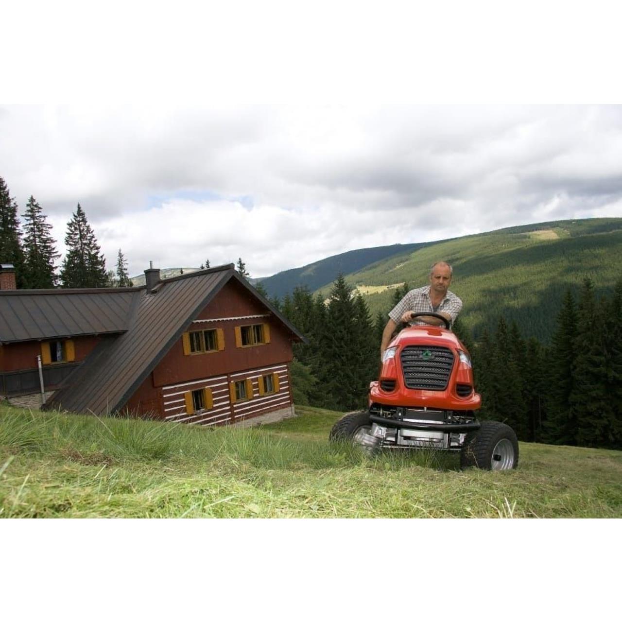 Das sehr stabil ausgelegte Mähwerk ist für die intensive Pflege bestens geeignet. Egal ob Hochgras oder regelmäßig gemähte Flächen, durch drei speziell geformte Kreuzmesser ist eine sehr gute Zerkleinerung und breitflächige Verteilung des Mähgutes gewährleistet. Durch die Konstruktion als Heckauswurfmähwerk wird die Steinschlaggefahr, wie man sie beim sonst üblichen Seitenauswurfdeck kennt, vermieden. Angeschweißte Deflektoren unter dem Mähdeck unterstützen zusätzlich die Zerkleinerung des Schnittgutes. Im Heckbereich eingesetzte Leitbleche garantieren eine sehr gute und gleichmäßige Verteilung des Schnittgutes.